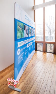 クイックパネル本体の骨組みに印刷メディアをかぶせるタイプなので、設置時の側面の厚み(奥行)が約4cmと場所をとらずに設置できることが、この商品の良いところです。